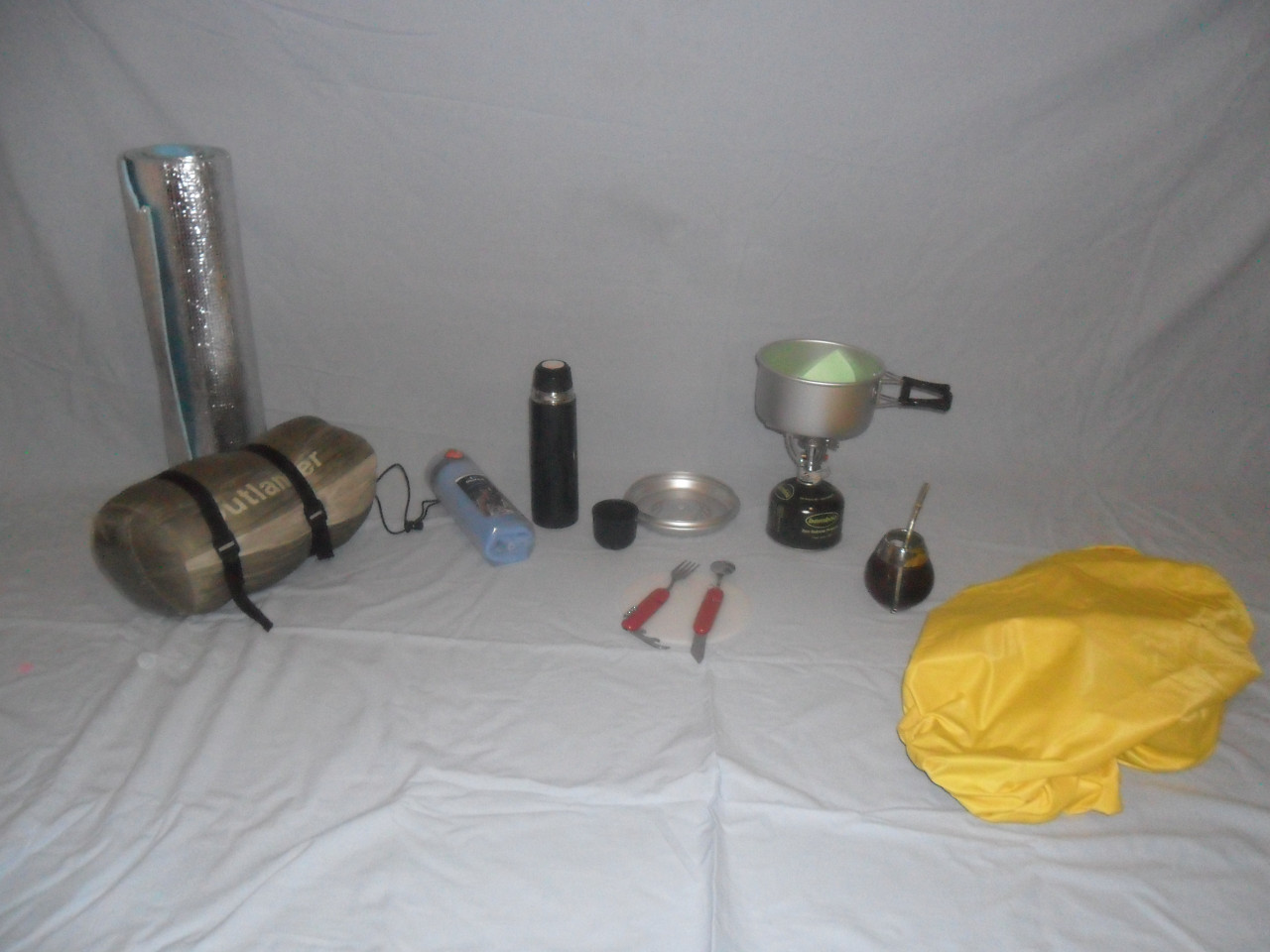 Carpa para 2 pers., Bolsa de dormir (buen rango termico -5º/-10 º, dicen que es frio el sur :P), cocina a gas, set de cocina para 2 pers, infaltable el mate y termo :) . tambien la comida y agua. tanto para hidratacion, como para cocinar.